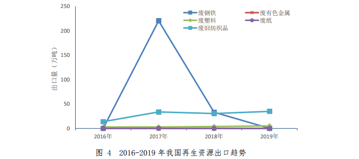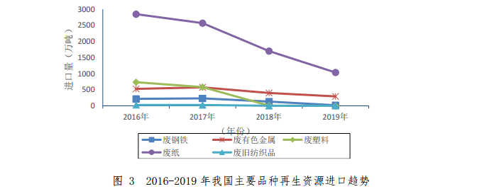 2019 年,我國廢鋼鐵、廢有色金屬、廢塑料、廢紙、廢舊紡織品五大品種再生資源進(jìn)口量為 1349.42 萬噸,同比下降 39.8%。其中降幅最大的是廢塑料,同比下降98.2%。2018-2019年我國主要品種再生資源進(jìn)口情況如表3所示。2016-2019 年我國再生資源進(jìn)口趨勢如圖 3 所示。
