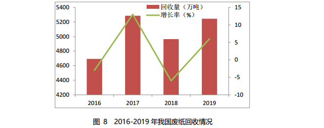 2019 年,我國廢紙回收量約 5244 萬噸,同比增長5.6%,廢紙回收率為 49.0%,廢紙利用率為 58.3%。在固體廢物進(jìn)口政策影響下,進(jìn)口廢紙量持續(xù)下滑,國內(nèi)廢紙回收量呈上升趨勢。2016-2019 年我國廢紙回收情況如圖 8 所示。