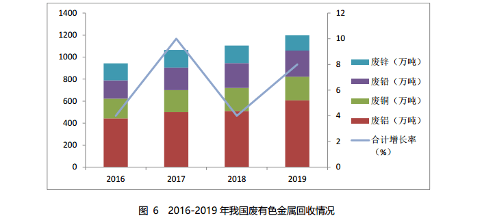 2019 年,國內(nèi)廢銅、廢鋁、廢鉛和廢鋅的回收量約1199萬噸,其中廢銅回收量約 215 萬噸,廢鋁回收量約607萬噸, 廢鉛回收量約237萬噸,廢鋅回收量約140萬噸。2016-2019年我國廢有色金屬回收情況如圖6所示。