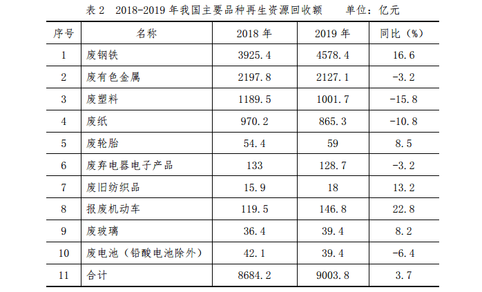 2019年,我國十大品種再生資源回收總額約9003.8億元,同比增長3.7%。報(bào)廢機(jī)動(dòng)車、廢鋼鐵、廢舊紡織品、廢輪胎、廢玻璃等品種的回收額均有增長,其中報(bào)廢機(jī)動(dòng)車回收額增幅最高,同比增長22.8%。2018-2019年我國主要品種再生資源回收額如表2所示。