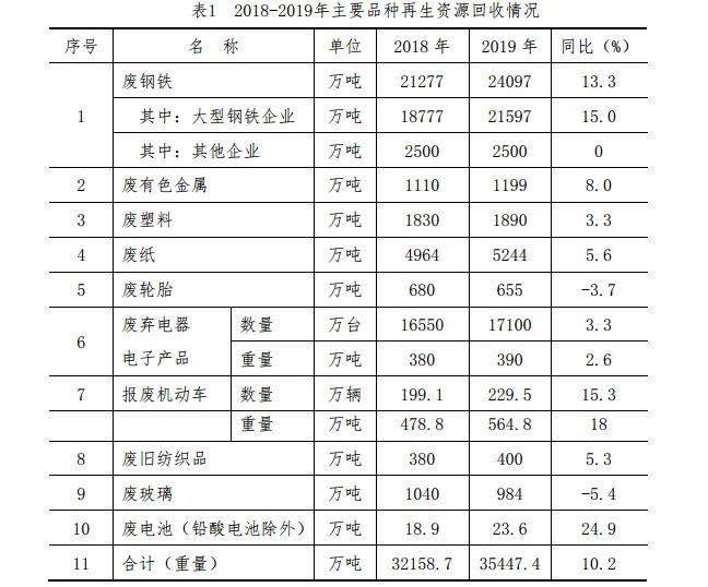 2019年,我國再生資源回收企業(yè)約10萬家,回收行業(yè)從業(yè)人員約1500萬人。截至2019年底,廢鋼鐵、廢有色金屬、廢塑料、廢輪胎、廢紙、廢棄電器電子產(chǎn)品、報(bào)廢機(jī)動(dòng)車、廢舊紡織品、廢玻璃、廢電池十大品種的回收總量約3.54億噸,同比增長10.2%。2018-2019年主要品種再生資源回收情況如表1所示。