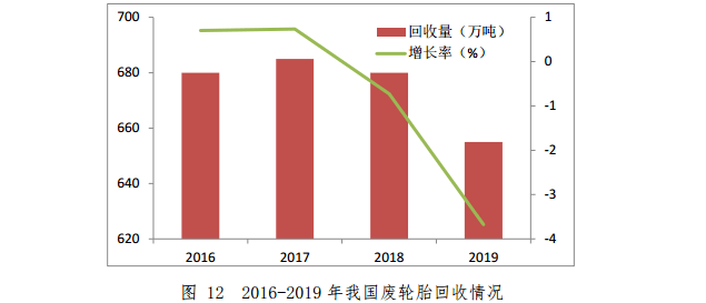 2019年,我國汽車輪胎產(chǎn)量為6.5億條,其中國內(nèi)消耗約3.8億條。2019年,廢輪胎回收利用企業(yè)約1500家,從業(yè)人員約10萬人,回收量約2億條,回收重量約655萬噸,同比下降3.7%。其中,輪胎翻新量約500萬標(biāo)準(zhǔn)折算條,再生橡膠產(chǎn)量約300萬噸,橡膠粉產(chǎn)量約100萬噸,熱裂解處理量約100萬噸。2016-2019年我國廢輪胎回收情況如圖12所示。