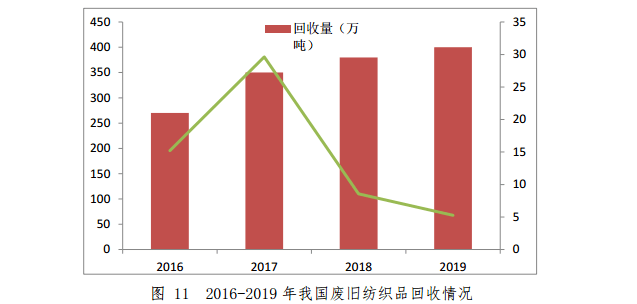 2019 年,我國棉、化纖和絲三類紡織纖維加工量約6610萬噸。據(jù)估算,每年產(chǎn)生廢舊紡織品超過 2000 萬噸,一類是消費(fèi)前工業(yè)加工領(lǐng)域的邊角料等,基本得到再生利用,另一類是閑散在居民手中的大量廢舊衣物和紡織品,再生利用率約 15%。2019年,我國廢舊紡織品回收量約為 400 萬噸, 同比增長 5.3%。2016-2019年我國廢舊紡織品回收情況如圖 11 所示。