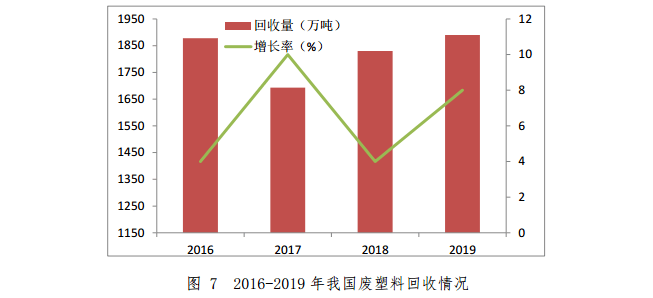 2019年國內(nèi)廢塑料回收量約1890萬噸,較2018年增加了60萬噸,增幅為3.3%。2019年廢塑料進(jìn)口量幾乎為零。2016-2019年我國廢塑料回收情況如圖7所示。
