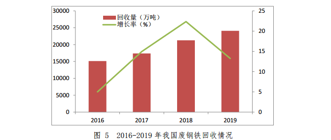 2019年,我國粗鋼和鋼材產(chǎn)量分別為9.96億噸和12.05億噸,同比增長8.3%和9.8%,粗鋼產(chǎn)量再創(chuàng)歷史新高;回收廢鋼鐵約24097萬噸1,同比增長13.3%。其中,重點(diǎn)大型鋼鐵企業(yè)回收廢鋼鐵約21597萬噸,同比增長15.0%;其他企業(yè)回收廢鋼鐵約2500萬噸,與2018年持平;廢鋼單耗為216.7kg/t 鋼,同比增加14.4kg/t鋼,增幅為7.1%,綜合廢鋼比21.67%, 同比增加1.49個(gè)百分點(diǎn)。2016-2019年我國廢鋼鐵回收情況如圖5所示。