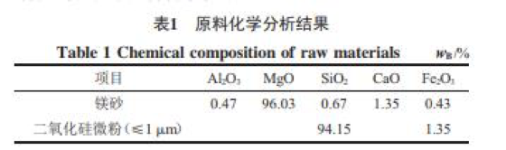 中頻爐爐襯作為感應(yīng)爐的重要組成部分,不但直接影響熔煉質(zhì)量,而且還影響生產(chǎn)成本。堿性爐襯具有抗堿性熔渣侵蝕的優(yōu)異性能,不污染鋼液,原料來源豐富,生產(chǎn)工藝簡單,使用方便等優(yōu)點(diǎn)。目前,以硼酸為燒結(jié)劑的堿性爐襯應(yīng)用廣泛,但由于硼酸的強(qiáng)烈助熔作用,導(dǎo)致爐襯的使用壽命短、熔煉成本高。本試驗(yàn)以二氧化硅微粉為燒結(jié)劑,利用其顆粒小、活性大、填???? 粉。該二氧化硅微粉是冶煉金屬硅或硅鐵時(shí),產(chǎn)生的揮發(fā)性SiO或Si氣體遇空氣迅速氧化而成的非結(jié)晶相無定形圓球狀顆粒,表面較為光滑,粒度小于1 μm的占87%以上,平均粒徑在0.2~0.3 μm,比表面積為19.2 m2/g,活性高?;瘜W(xué)成分分析見表1。表1 原料化學(xué)分析結(jié)果