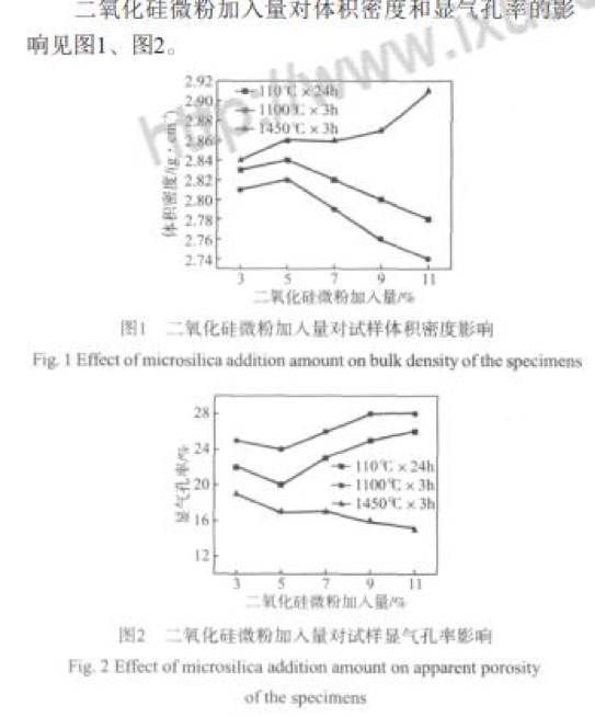 在110 ℃×24 h條件下烘干時(shí),當(dāng)二氧化硅微粉加 入量小于5%時(shí),由于二氧化硅微粉的顆粒小,分散性 好,可以填充顆粒與顆粒間的空隙[1],這使材料顆粒堆 積的致密度逐漸提高,氣孔率減少,體積密度逐漸增 加 (圖1);隨著二氧化硅微粉加入量的增加,材料中的氣孔率逐漸減少,材料致密度逐漸增加,體積密度 就逐漸增大;當(dāng)二氧化硅微粉加入量大于5%時(shí),隨著 二氧化硅微粉加入量的逐漸增多,二氧化硅微粉充填 空隙后出現(xiàn)過剩導(dǎo)致材料堆積致密度下降;同時(shí)大量 的二氧化硅微粉水化產(chǎn)物烘干后失去自由水和部分結(jié) 合水導(dǎo)致材料氣孔率逐漸增大 (圖2),從而使試樣的 體積密度逐漸減小。 在1 100 ℃×3 h條件下燒結(jié),試樣體積密度普遍小 于110 ℃×24 h樣品的體積密度 (圖1),而氣孔率普遍 高于1 10 ℃×24 h樣品的 (圖2)。因?yàn)樵? 100 ℃時(shí), 由于燒成溫度低,試樣達(dá)不到燒結(jié)溫度,材料內(nèi)部形 成的液相量少,不足以填充空隙以提高材料的致密度; 在此溫度下,試樣的主要變化是二氧化硅微粉水化產(chǎn) 物的完全脫水,二氧化硅微粉加入量越多,二氧化硅 微粉水化產(chǎn)物脫水引起氣孔率增加而導(dǎo)致體積密度減 小的影響就越強(qiáng),故隨著二氧化硅微粉加入量的增大, 試樣的體積密度呈減小的趨勢;同時(shí)作為結(jié)合劑的二 氧化硅超微粉在升溫過程中發(fā)生晶型轉(zhuǎn)化,引起試樣 體積膨脹[2],體積密度變小。 在1 450 ℃×3 h條件下燒結(jié),試樣體積密度普遍增 大 (圖1)。隨二氧化硅微粉加入量的增加,試樣體積 密度逐漸增大,氣孔率逐漸降低 (圖2)。在1 450 ℃ 下,鎂質(zhì)澆注料中的MgO和SiO2生成鎂橄欖石[3],即: 2MgO+SiO2→2MgO·SiO2,這使材料燒結(jié),體積收縮, 結(jié)構(gòu)致密程度提高,體積密度增大。隨二氧化硅含量 的增加,2MgO·SiO2生成量逐漸增加,體積密度逐漸 增大,氣孔率逐漸降低。