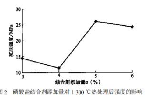 圖1、圖2是以磷酸鹽為結(jié)合劑、Al-80水泥為固化劑的四個(gè)配方試樣的性能檢測(cè)結(jié)果,隨著結(jié)合劑添加量的增大,110℃×24h烘干后澆注料試樣的抗壓強(qiáng)度呈上升趨勢(shì),但在≤4%和≥5%的添加量范圍內(nèi),隨結(jié)合劑添加量的增加試樣的抗壓強(qiáng)度增大幅度很小,而在4%~5%的范圍內(nèi),抗壓強(qiáng)度隨結(jié)合劑添加量的增加而急劇提高。對(duì)于經(jīng)1300℃熱處理后的試樣,結(jié)合劑添加量在≤4%和≥5%的范圍內(nèi),試樣的抗壓強(qiáng)度隨結(jié)合劑的增加而呈微弱的下降趨勢(shì),但抗壓強(qiáng)度隨結(jié)合劑添加量的增加而急劇提高。綜合可見,對(duì)于本實(shí)驗(yàn)選擇的原材料與實(shí)驗(yàn)范圍內(nèi),磷酸鹽結(jié)合劑合理的添加量為4%~5%。