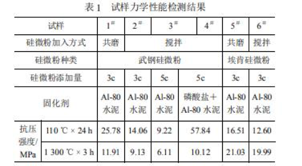 表1是以不同種類、不同添加量的硅微粉為結(jié)合劑和以磷酸鹽、Al-80水泥為固化劑的澆注料力學(xué)性能檢測(cè)結(jié)果。由表1可見,硅微粉的種類、加入方式、添加量以及固化劑種類對(duì)試樣的力學(xué)性能影響較大。由1#、2#試樣和5#、6#試樣的檢測(cè)結(jié)果可見,與硅微粉的直接攪拌加入方式相比,共磨加入方式能明顯改善澆注料的力學(xué)性能。由3#、4#試樣的檢測(cè)結(jié)果可見,固化劑種類對(duì)澆注料性能影響較大,并可看出磷酸鹽與Al-80水泥組成的復(fù)合固化劑具有明顯改善修補(bǔ)料性能的效果,而Al-80水泥則效果不明顯。由2#、3#試樣的檢測(cè)結(jié)果可見,硅微粉添加量的提高未能提高澆注料的力學(xué)性能。由采用相同的加入方式而硅微粉來(lái)源不同的1#、5#和2#、6#試樣的檢測(cè)結(jié)果可見,??瞎栉⒎叟c武鋼硅微粉相比,能明顯改善澆注料熱處理后的力學(xué)性能,并且添加??瞎栉⒎鄣臐沧⒘峡箟簭?qiáng)度隨試樣的熱處理溫度的提高而不斷增大。綜合可見,宜采用埃肯硅微粉作為鎂質(zhì)澆注料的結(jié)合劑,合適的添加量應(yīng)為3c%左右。