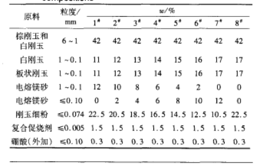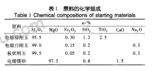 以電熔棕剛玉、白剛玉、板狀剛玉、鎂砂為顆粒料,鎂砂細(xì)粉、剛玉細(xì)粉為粉體,添加高溫復(fù)合促燒劑,以硼酸為外加劑。主要原料的化學(xué)組成如表1所示。