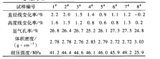 1m8試樣的堆積密度分別為2.78、2.81、2.84、2.81、2.78、2.78、2.83和2.84g·cm~,可見所試驗(yàn)的幾種粒度配比的試樣堆積密度差別不大。觀察1m8燒后試樣發(fā)現(xiàn):1000oC3h燒后的各試樣都沒有脫模強(qiáng)度,說明在1000時(shí)試樣不會(huì)燒結(jié)。除8試樣外,各試樣經(jīng)過l200℃3h燒后有一點(diǎn)脫模強(qiáng)度,說明在l200℃時(shí)試樣產(chǎn)生了少量的燒結(jié),但燒結(jié)程度不大;各試樣經(jīng)過1350oC3h燒后,具有一定的燒結(jié)強(qiáng)度,但8試樣的強(qiáng)度最低。經(jīng)1600oC3h燒后1一8試樣的性能如表4所示。由表4可看出:經(jīng)1600oC3h燒后,沒有添加鎂砂的8試樣體積密度最大,材料的線變化最小,燒結(jié)強(qiáng)度較低,可以看出鎂砂對(duì)搗打料的燒結(jié)強(qiáng)度貢獻(xiàn)較大。干式搗打料中,增加粗顆粒添加量可以提高試樣抗熱震性,但是粗顆粒添加比例過高會(huì)降低試樣的燒結(jié)性能和燒后強(qiáng)度。細(xì)顆??杀WC試樣經(jīng)高溫?zé)Y(jié)后內(nèi)部氣孔較少且尺寸較小,使試樣具有良好的致密性,但是細(xì)顆粒添加比例過高會(huì)使試樣燒后產(chǎn)生較大裂紋,試樣收縮率過大會(huì)降低抗熱震性。綜合各配比情況,認(rèn)為4配方綜合性能較好。