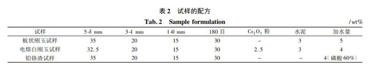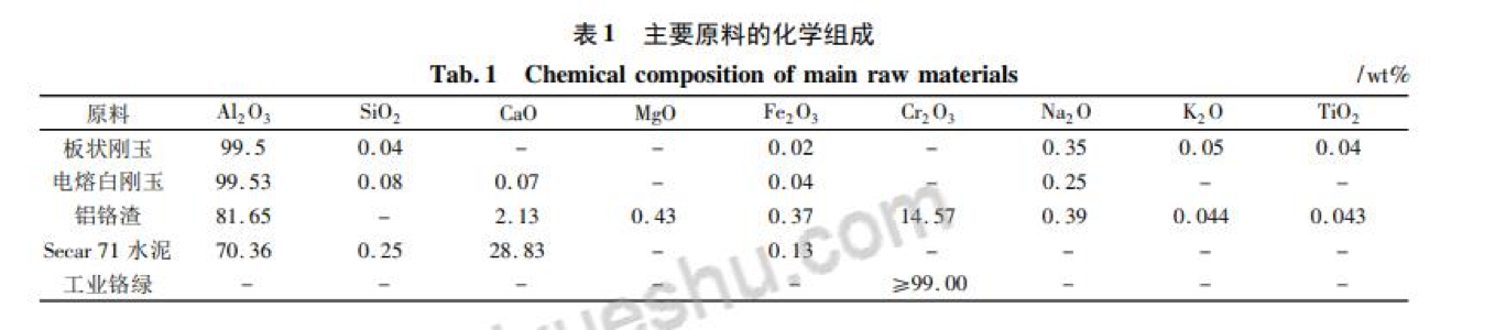 實驗用主要原料有板狀剛玉( 5 ~ 3 mm、3 ~ 1 mm、1 ~ 0 mm 和≤0. 088 mm) 、電熔白剛玉( 5 ~ 3 mm、3 ~ 1 mm、1 ~ 0 mm 和≤ 0. 088 mm) 、鋁鉻渣( 5 ~ 3 mm 、3 ~ 1 mm、1 ~ 0 mm 和≤ 0. 088 mm) 、純鋁酸鈣水泥( Secar 71) 、磷酸溶液( 濃度 60% ) 和工業(yè)鉻綠。板狀剛玉體積密度 5. 53 ~ 5. 57 g·cm - 3,吸水率為 1. 0% ~ 1. 09% ,顯氣孔率約 4. 1% ~ 4. 8% ; 電熔白剛玉體積密度 3. 54 ~ 3. 70 g·cm - 3,吸水率為 2. 43% ~ 2. 58% , 顆粒料的顯氣孔率約 6. 1% ~ 7. 4% ; 鋁鉻渣顆粒體積密度為3. 29 ~ 3. 37 g·cm - 3,吸水率為 4. 2% ~ 4. 6% , 顯氣孔率 10. 3% ~ 12. 1% 。原料的化學(xué)組成見表 1。
