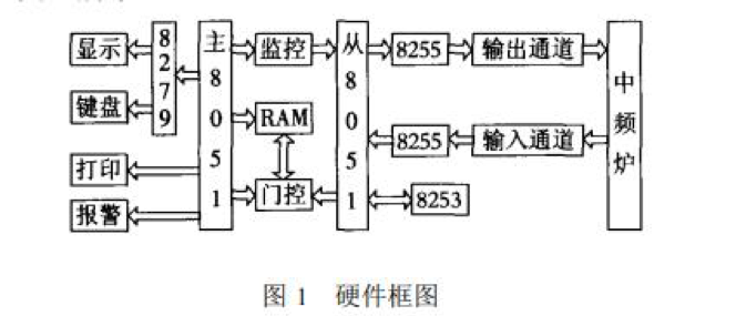 本系統(tǒng)是以 2 片 8051 單片機(jī)外圍接口電路構(gòu) 成的一個(gè)主從式雙工中頻電爐爐溫控系統(tǒng) ,硬件總體框圖如 圖 1 所示。