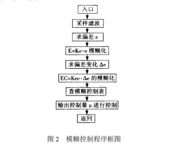 中頻爐溫度的模糊控制器是模糊控制系統(tǒng)的核心 ,它是一 種利用專(zhuān)家知識(shí)和操作者經(jīng)驗(yàn)設(shè)計(jì)的專(zhuān)家控制系 統(tǒng) ,設(shè)計(jì)時(shí)不用數(shù)學(xué)解析模型來(lái)描述受控系統(tǒng)的 特性。在本溫度控制系統(tǒng)設(shè)計(jì)中 ,采用二維模糊 控制器 ,即以偏差 e 和偏差變化率Δe 作為模糊控制器的輸入變量 ,把加熱操作量作為輸出變量。 在模糊控制過(guò)程中 ,同時(shí)把偏差和偏差的變化率 作為模糊輸入量 ,這種方法不僅能保證系統(tǒng)控制 的穩(wěn)定性 ,而且還可減少超調(diào)量和振蕩現(xiàn)象。根 據(jù)受控系統(tǒng)的實(shí)際情況 ,確定輸入變量的測(cè)量范 圍和輸出變量的控制作用范圍 ,以確定每個(gè)變量 的論域 , Ke、Kec 和 Ku 分別為輸入和輸出變量的 量化因子和比例因子。先經(jīng)限幅處理 ,再經(jīng)量化 處理就得到了 E 和 EC。根據(jù)當(dāng)前已求得的 E 和 EC ,直接查詢(xún)模糊控制表就獲得控制量的變化值 ΔU ,將該變化值ΔU 乘以比例因子 Ku ,即可得到 當(dāng)前的實(shí)際控制量增量Δu。再將該增量和前一采 樣時(shí)刻的實(shí)際控制量相加 ,就得到目前應(yīng)實(shí)施的 控制動(dòng)作 ,即 uk = uk - 1 + Ku ·ΔU ,其模糊控制 程序框圖如圖 2 所示。