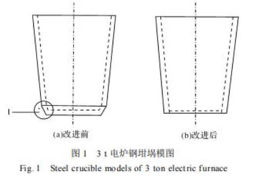 3t中頻爐鋼坩堝模具的原始設(shè)計(jì)如圖1(a)所示。它是由兩個(gè)截短的空心錐體組成的鋼制坩堝模具。這種結(jié)構(gòu)的鋼制坩堝模具在建造熔爐時(shí)具有一個(gè)缺點(diǎn),即,(1)部分中的死砂不易結(jié)實(shí),并且容易引起鐵水泄漏。改進(jìn)的鋼制坩堝模具的形狀如圖1(b)所示,它是帶有截頭空心錐的鋼制坩堝模具。這種改進(jìn)有助于在熔爐制造過(guò)程中打結(jié)。沒(méi)有死角,從根本上解決了原始鋼制坩堝模具的打結(jié)(1)不易打結(jié)的問(wèn)題。實(shí)踐證明,這種改進(jìn)是非常成功的,并且是延長(zhǎng)爐齡的關(guān)鍵之一。