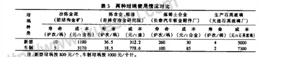 根據(jù)用戶反饋的情況,兩種中頻電爐坩堝的使用性能差別很大。新型石墨坩堝無砂眼、不滲漏;耐腐蝕性均勻,使用壽命長而穩(wěn)定。電極車制坩堝常出現(xiàn)砂眼和滲漏,并且無規(guī)則,使用壽命長短不一.很難掌握冶煉爐次,經(jīng)常造成漏爐事故。兩種中頻電爐坩堝的使用情況對(duì)比見表3。